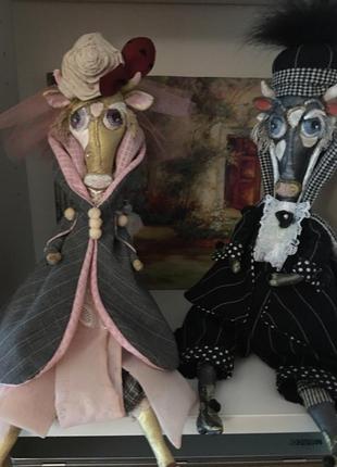 Интерьерная текстильная игрушка выполнена по мастер классу Анастасии Голеневой. Устойчиво сидят. Предлагаются по одному. Бычок Луи денди (черно- белый), бычок Леонардо (зеленый бархатный сюртук) дама розово- серая Лолита. Размер 30см +/-