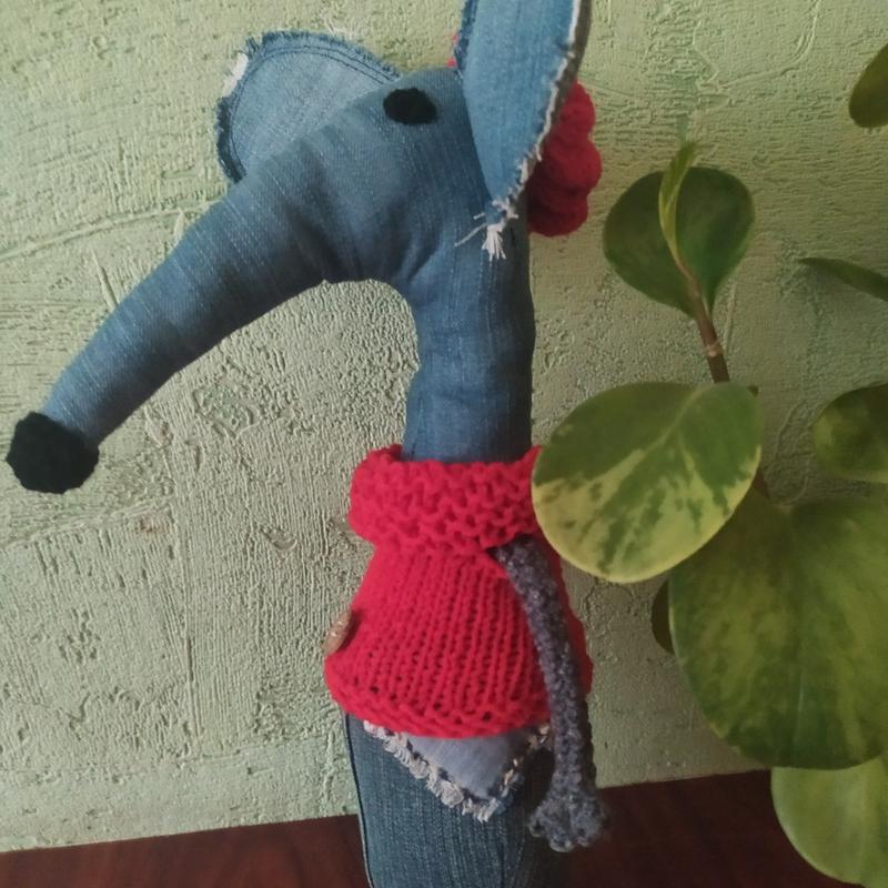 игрушка из джинсовой ткани интерьерная - " мышка ". Ручная работа. Мягкая. Высота 35 см. Одежка - вязаная.