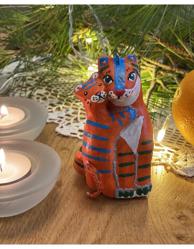 Ялинкова іграшка з колекції присвячена року Тигра. Кожна іграшка створюється вручну, проходить етап випікання, шліфування та ручного розпису. Іграшка від цього стає міцна та легка і вона не б'ється. Щоб завоювати прихильність Тигра на цілий рік, гарною ідеєю буде завести собі талісман фігурки тигра. Іграшка на ялинку із символом року буде чудовим варіантом подарунку. Розмір: 6х9х5см Вага: 45 г