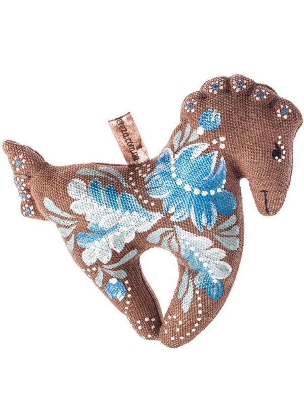 Іграшка в етно стилі створена тернопільськими майстрами. Коник пошитий з натуральних тканин, покритий розчином кави, кориці, ваніліну, аромат іграшки зберігається приблизно півроку. Етно розписи виконані вручну. Символ вірності, відданості, швидкості, витривалості. Кінь незмінний порадник свого господаря і служить йому до останньої хвилини.«Українська міфологія» Войтович В., К:Либідь, 2012 Розмір іграшки: 3.5х16.5х17 см. Вага: 60 г.