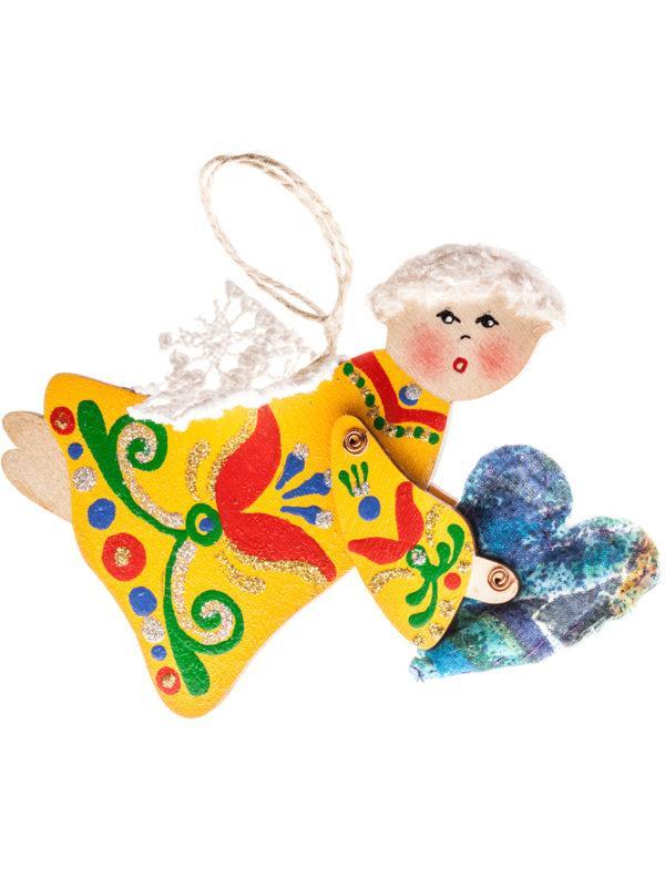Іграшка в етно стилі створена тернопільськими майстрами з дерева (ясінь). Янгол тримає в руках текстильне сердечко, зшите вручну та наповнене ароматними травами: м'ятою, чебрецем, цвітом базиліку. Ручки рухаються. Для розпису використовуються високоякісні акрилові фарби, безпечні для людини. Етно розписи виконані вручну, декорований мереживом. Цей янгол, за задумом дизайнерів майстерні, є янголом, який приносить щастя. Таким сувеніром можна прикрасити оселю, а взимку - різдвяну ялинку. Даруйте янгола на день народження, на день янгола, на пам'ять або як прояв вдячності. Розмір іграшки: 1х11х8 см. Вага: 20г.