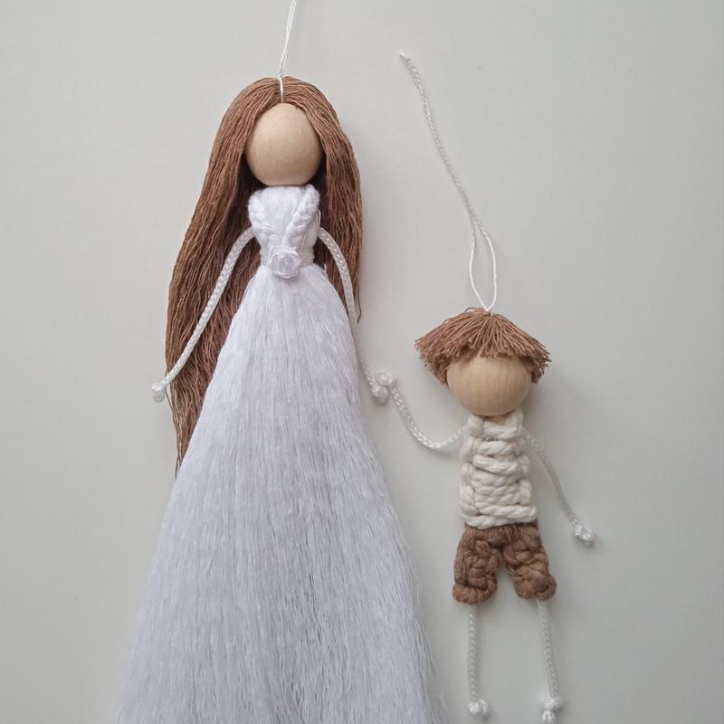 высота мамы 20 см, мальчика 13 см возможны варианты в другом цвете и можно добавить венчик из цветов или шапочку, по Вашему желанию