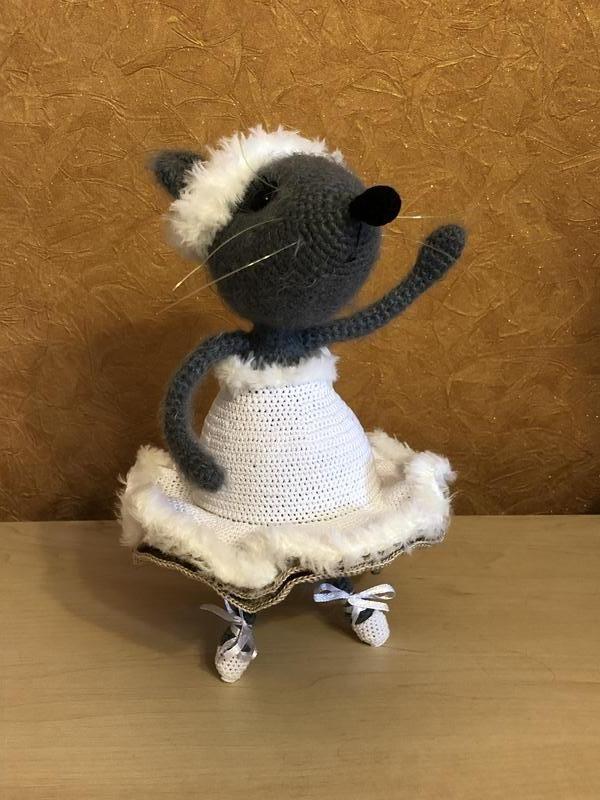 Сувенирная игрушка мышка. Высота игрушки 23 см. Изготовлена из пушистой пряжи Naco и хлопковой пряжи, наполнена холлофайбером. Все детали пришиты, глазки приклеены. Проволока вставлена в хвост, лапы и головной убор. Платье и пуанты съемные. Усы из лески. Только сухая чистка.