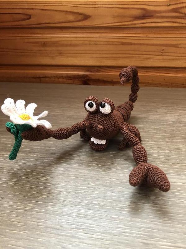 Связан крючком из хлопковой пряжи. Наполнен волокнистым наполнителем. В туловище скорпиона и цветка вставлена проволока. Зрачки глаз приклеены. Цветок не пришит. Высота с хвостом 7 см, длина 20 см. Связан по описанию Олеси Царевой. Только сухая чистка!