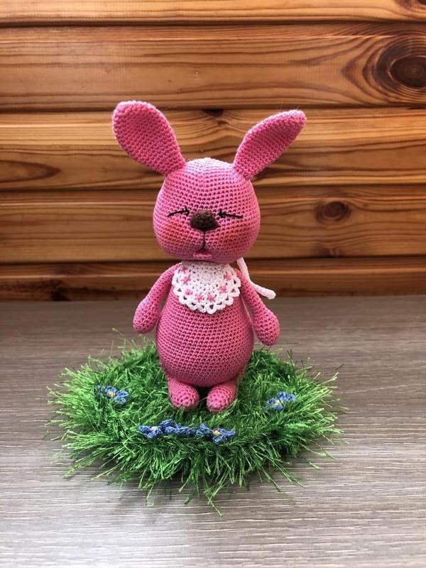 Вязаный крючком из хлопковой пряжи, наполненный холлофайбером. Все детали пришиты, щечки тонированные. Высота 15 см. Коврик связан из пряжи « травка».