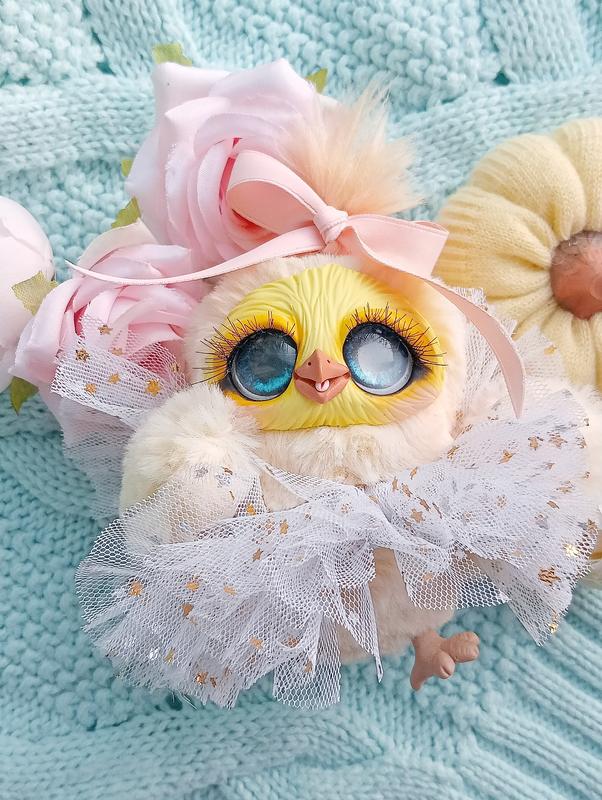 Игрушка в смешанной технике в виде милой девочки цыпленка. Выполнена из искусственного меха и полимерной глины. Глазка стеклянные, крылья гнутся. Размер 8 см. дополнительно юбочка и бантик.