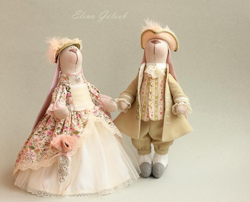 Граф і графиня Кролікофф - королівські придворні епохи бароко. Шикарне плаття в дрібну квіточку з тонкого італійського батіста з пишною нижньою спідницею у Панянки. Камзол, жилет, короткі штанці-бриджі з панчохами , мереживне жабо і рукави сорочки у Кавалера Пастельні відтінки,велика кількість мережива в обробці , витончені аксесуари,, пір'я на капелюхах.... Такі зайчики стануть прикрасою інтер'єру в класичному стилі , а також порадують любительку стилю і костюмів епохи бароко і рококо. Точний повтор пари неможливий.) Але ми завжди зможемо знайти компроміс і придумати пару саме для Вас в такому стилі , але в іншому кольорі і з інших тканин Товар виготовляється на замовлення