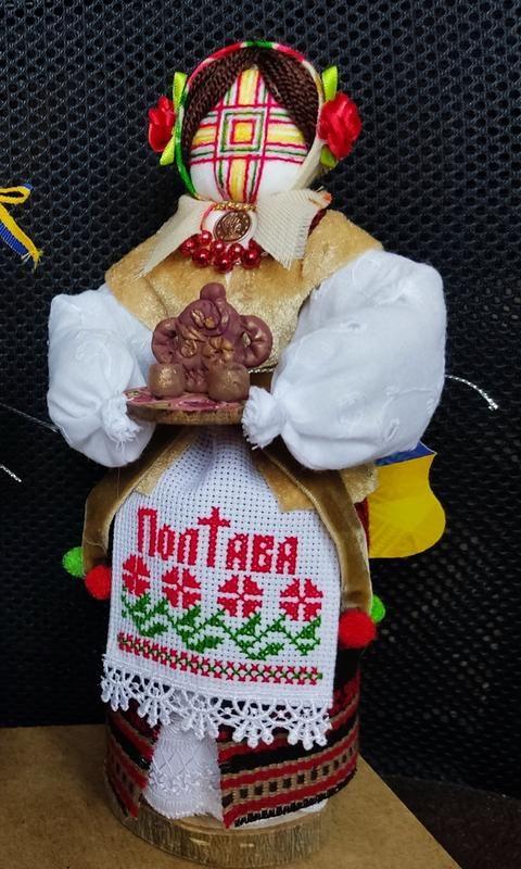 Кукла – мотанка «Щедра». Авторская узловая кукла, созданная по традициям народной куклы-мотанки. Кукла с крестом вместо лица символизирует гармонию вертикали (духовности) и горизонтали (земного развития человека), то есть помогает гармонизировать пространство. Угощение в руках куклы символизируют гостеприимство, благополучие и достаток семьи. Фартук или рукава можно украсить традиционными украинскими орнаментами, надписью города или узором по Вашему выбору. Кукла закреплена на подставке из ДВП. Высота куклы с подставкой 20-22 см. Ручная вышивка на переднике, использованы натуральные и декоративные ткани, декор. Упаковка: пластиковая прозрачная коробка 25см*10см*10см