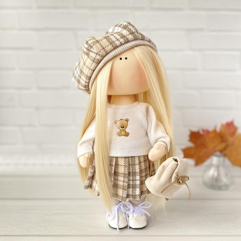 Дівчинка виготовлена з лялькового трикотажу. Розмір красуні 31 см у береті) Весь одяг біля лялечки знімається, ручки гнуться, голова нахиляється. Волосся можна розчісувати. Рюкзачок теж ручної роботи. Така іграшка потішить і принесе масу позитивних емоцій дівчаткам будь-якого віку та положення) даруйте своїм близьким зворушливі та душевні подарунки! Товар під замовлення