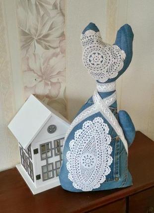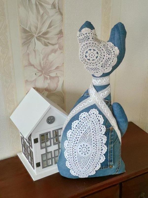 Кот. Выполнен из джинсов. Декорикован винтажным кружевом.