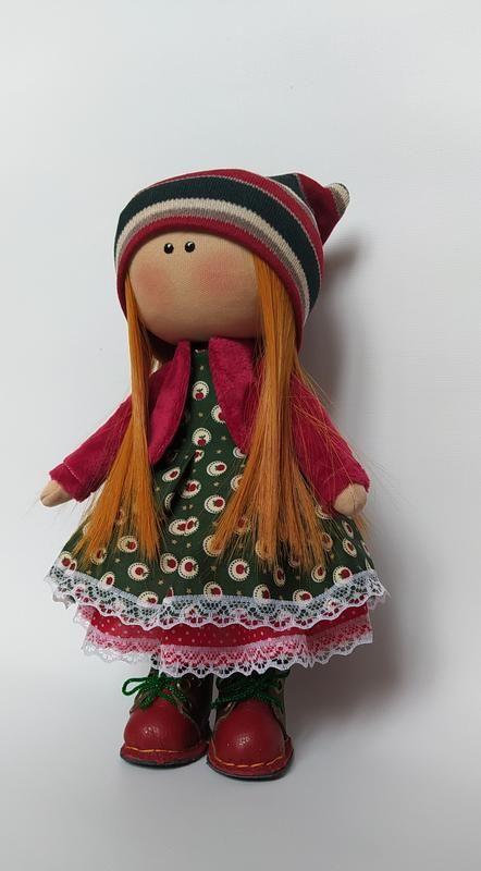 Текстильна лялька ручної роботи пошитий з бавовняних тканин. Зріст лялечки 30см. Ручки, ніжки і голова рухливі, одяг не знімається.