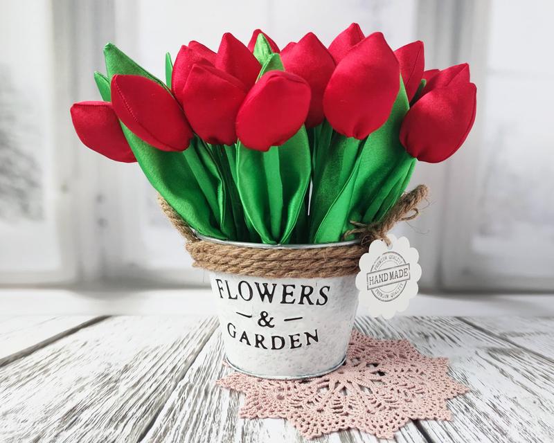 Текстильные тюльпаны -это уникальный подарок для дорогих и близких людей к любому празднику. Это изысканный подарок для самой стильной леди и прекрасный подарок для корпоративных поздравлений сотрудниц и партнеров с весенними праздниками. Букет состоит из 29 цветов красного цвета в кашпо. Кашпо металлическое окрашенное, декорировано натуральным льняным шпагатом. Кашпо металлическое окрашенное, декорировано натуральным льняным шпагатом. Тюльпаны изготовлены из креп-сатина, что придает им красивый натуральный блеск. Высота букета 24-25 см, ширина около 25 см. Также в работе используется пенопластовая основа и сизаль