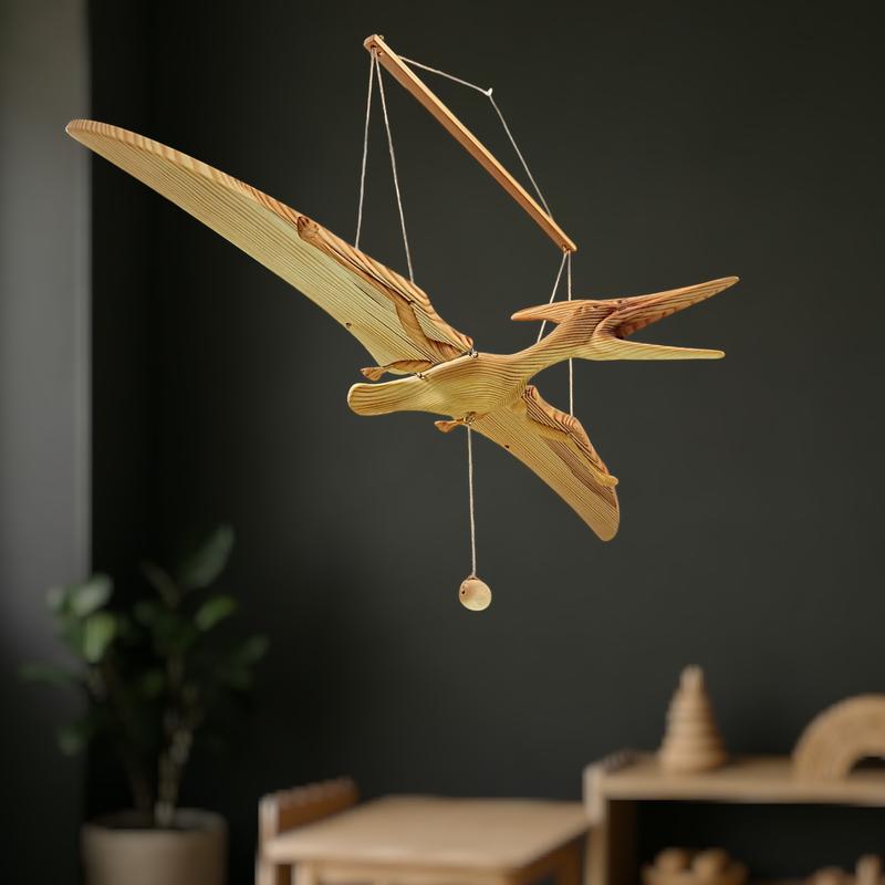 Представляем деревянного птеродактиля – мобиль из натуральной сосны, покрытый экологическим маслом-виском, сохраняющий естественную текстуру и цвет дерева. Подвижные крылья оживают при легком потяжке за бусинку, создавая эффект плавного махания, будто настоящий птеродактиль парит в воздухе. Размах крыльев 80 см, подвешенный на прочных льняных веревках, этот мобиль станет стильным и уникальным акцентом в вашем интерьере – в детской комнате, гостиной или даже на террасе. Ручная работа гарантирует внимание к деталям и высокое качество. Экологичное покрытие маслом-веском не только защищает дерево, но и делает его приятным на ощупь. Этот птеродактиль - идеальный подарок для тех, кто ценит натуральность, движение и оригинальный дизайн в декоре. Характеристики: Материал: сосна натуральная Покрытие: масло-воск (экологическое) Размах крыльев: 80 см Подвеска: льняные веревки Ручная работа