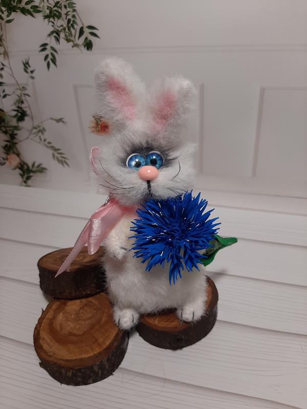 Інтер'єрна в'язана іграшка ручної роботи. Повністю на дротовому каркасі, висота 14 см, очі скляні, носик сліплений із полімерної глини, волошки зроблені з фомірану.
