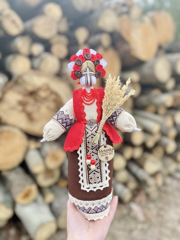 Берегиня — це особливий тип ляльки-мотанки, яка символізує захисницю дому та родини. Її ім'я походить від слова «берегти», і вона вважається головною хранителькою домашнього затишку, добробуту і гармонії. Основні риси ляльки-мотанки Берегині: 1. Хрест на обличчі: Замість обличчя на ляльці є хрест із ниток, який символізує сонце, гармонію і захист. Лялька без обличчя, щоб уникнути "вселення" у неї душі або злих сил. 2. Матеріали: Виготовляється лише з натуральних тканин, що символізує зв’язок із природою та гармонією. Використовуються клаптики старого одягу чи полотна, яке має енергетику родини. 3. Призначення: Її розміщували в оселі на почесному місці, щоб вона «оберігала» простір, або дарували на щастя та удачу. 4. Вбрання: Лялька Берегиня зазвичай одягнена у національні кольори або вбрання, що символізує багатство та добробут родини. Часто додають елементи вишивки чи намисто. . Висота: 28-30 см