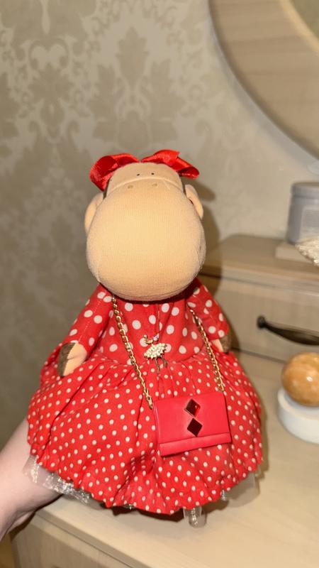 Чарівна м'яка іграшка, виготовлена вручну з особливою любов'ю та увагою до деталей. Одягнена в яскраву червону сукню в білий горошок з пишною спідницею (під якою видно кілька шарів тканини, зокрема біла та прозора з рюшами). На голові кокетливий червоний бантик. Через плече перекинута маленька червона сумочка на золотистому ланцюжку. Мавпочка має світло-бежеву мордочку та маленькі круглі вушка. Її образ доповнюють прозорі чобітки на ніжках. Ця унікальна іграшка, створена руками майстра, стане особливим подарунком або цінним екземпляром колекції.