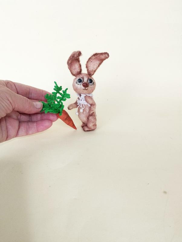 Зайчик, заяц, iнтерьерная игрушка, вязаная игрушка - Вязаный кролик из ангоровой пряжи, связанный крючком - Ушки армированные, готовые глаза и носик - Нитяное крепление, немного тонирование - Жилет связан крючком из белой хлопковой пряжи, завязки с бусинками - Дополнительный аксессуар морковка из пластики, зеленый бадиль связан крючком - Цвет кофе с молоком - Полностью ручная работа Высота игрушки 8 см. (С ушками 12 см.) Цена 600 гривен Цвет может отличаться в зависимости от настроек монитора Игрушка не предназначена для активных детских игр! Милый зайчонок в едином экземпляре (точная копия не возможна) Такую игрушку можно подарить как сувенир и она всегда будет напоминать о вас. Этими игрушками можно украсить интерьер вашего дома. Вот в чем наиболее достойная ценность вязаных игрушек крючком. Рада видеть Вас у себя в профиле, с уважением, Надежда