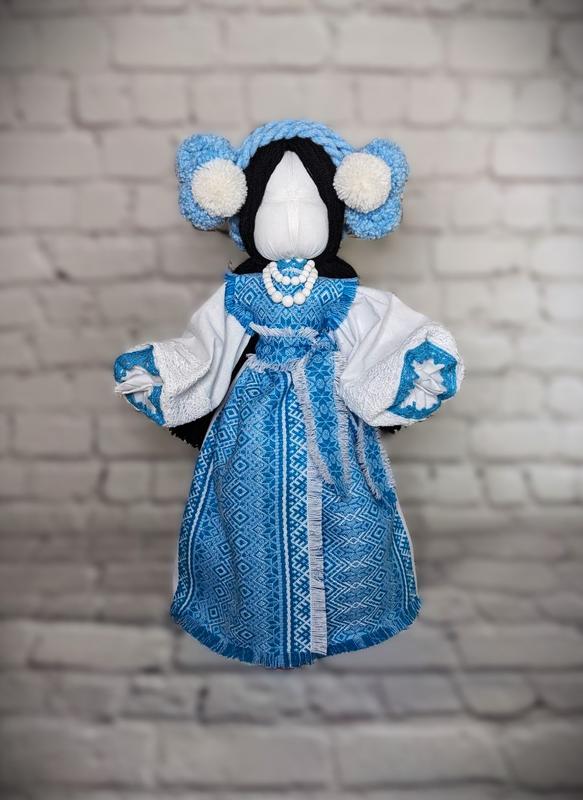Кукла мотанка Зимняя. Интерьерная куколка в народных традициях выполнена из натуральных материалов, белый хлопок с машинной вышивкой голубого цвета, хлопковое кружево, ожерелье из белых агатов. Рост куклы 38 см, закрепленная на деревянной подставке, ручки гибкие, одежда и венчик не снимаются.