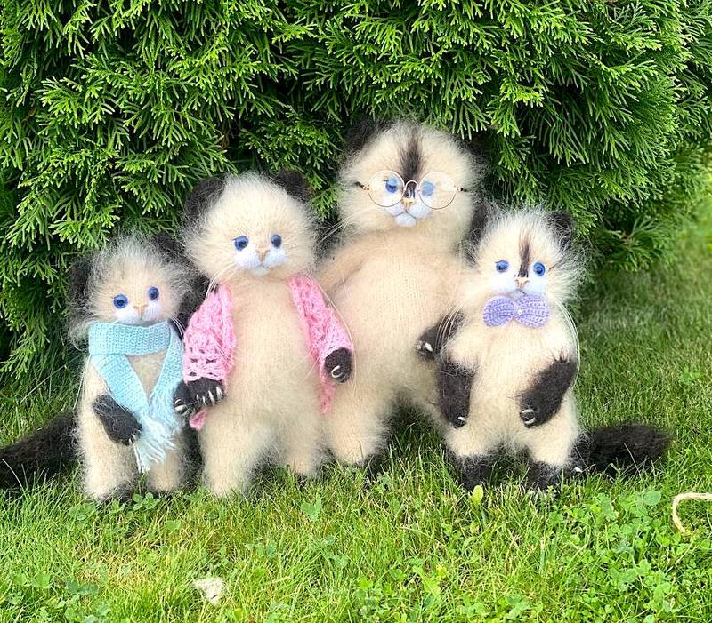 Сім я сіамських котиків. Виконані з натуральної м якесенької шерсті, всередині іграшок проходить мідний дротовий каркас, всі частини тіла згинаються, що дозволяє надати котикам бажаного положення в просторі. Очі скаляні, носик керамічний. Одяг на фото продається разом з котами. Висота найвищого кота 35 см. Іграшки можна прати у злегка теплій воді, використовуючи шампунь та кондиціонер. Розчісувати щіткою. Сушити на відкритому повітрі. Не рекомендується для активних ігор та для ігор маленьких дітей, так як іграшки містять мілкі деталі та довгу натуральну шерсть.