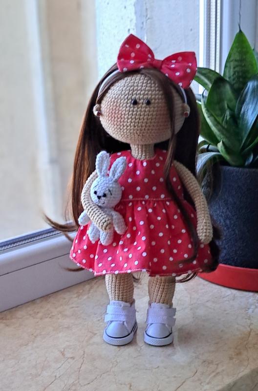 Кукла полностью из гипоаллергенных материалов вязаная крючком. Рост 28см, стоит за счет обуви. Волосы можно расчесывать и делать различные прически. Голова и руки подвижные. Вся одежда съемная (по желанию можно добавить другой комплект одежды - оплачивается отдельно). Можно использовать как игровую. Станет хорошим подарком девочке любимого возраста.
