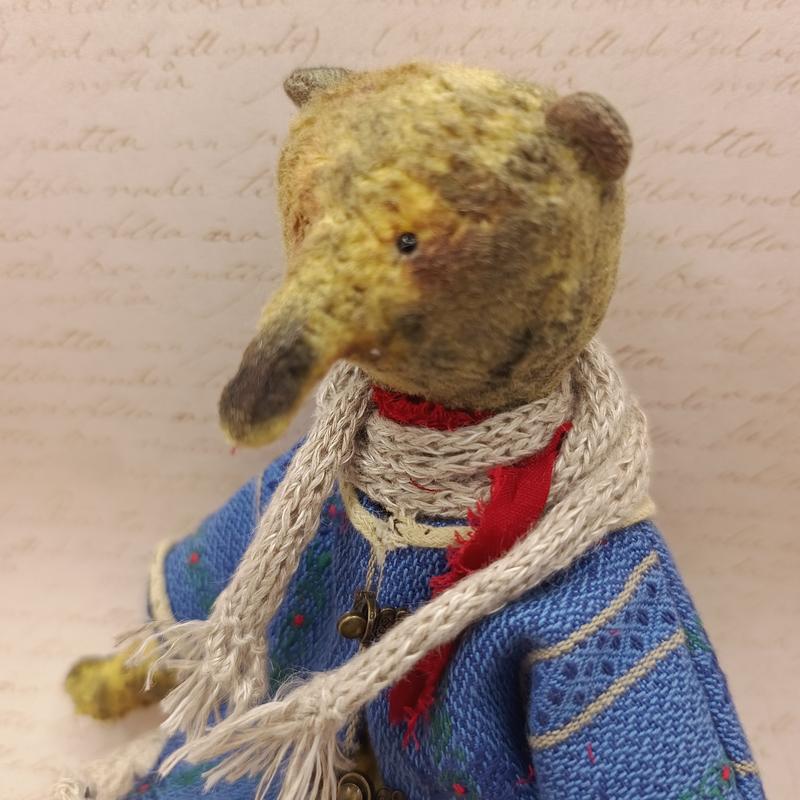 Мишутка из состаренного плюша, с маленькими глазами и длинным носом Головы и лапы подвижные, на специальных шплентах. В середине опилки и деревянная шерсть. В животик добавлен металлический мелкий песок для ощущения живой игрушки. Мишутка одета в несъемный сарафан и пальто ( пальто снимается). Одежда выполнена из винтажной ткани и украшена старым кружевом. Мишка тонированная масляной краской и сухой пастелью. Высота игрушки 21 см