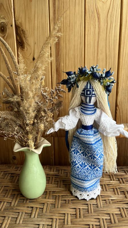Мотанка - это старинный славянский оберег, возраст которой насчитает не одну тысячу лет! Издавна кукла-мотанка считалась воплощением женской силы, мудрости, стремлении оберегать и защищать свою семью. Каждая мотанка - это хранительница рода, и потому ее часто дарят молодоженам в день свадьбы, своим самым близким и дорогим сердцу людям с пожеланиями добра, здоровья, благополучия. Мои мотанки сделаны с большой любовью и чистыми помыслами. Они станут лучшим подарком-сувениром, выполненным в единственном экземпляре. Высота этой нежной красавицы - 25 см, основа - подставка из натурального дерева. Мотанка упакована в коробку