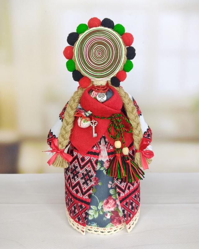Берегиня Роду, Гласс Предков Сварожица - это берегенок, соединяющий человека с его Родом, с голосом предков, который звучит в сердце, крови, снах и знаках судьбы. Она — проводница к источнику Силы Роду, помощница в восстановлении рода, его памяти и защите. ☀️ Ее предметы силы На ее лице - Сварга, знак Святебного Огня Свара, символ Небесного Творения и вечного движения жизни. Она вращает круг рода, очищает его, сцеливает и наполняет силой предков. Косы — живая связь поколений, сплетающая прошлое, настоящее и будущее. Помпоны вокруг головы – круг энергий, единство стихий и состояний: красный – сила жизни и кровь рода, черный – мудрость и память, зеленый – обновление, продолжение рода. Красное ожерелье - оберегает женской силы, любви и достоинства. Подвеска с Древом Роду - напоминание, что каждый является веточкой большого дерева, которое живет через нас. Пояс Роду — нить принадлежности, символ наследственной силы, защиты и поддержки предков. Ключ - открывает дверь к роду, к пониманию себя, к исцелению прошлых историй. Мешочек с травами - помогает установить связь с Родом, мост к предков, почувствовать их присутствие в разделах и знаках. 🎋 Кольори: 🔴 Красный - кровь рода, любовь, энергия жизни. ⚫ Черный - сила земли, глубокая мудрость предков. 🟢 Зеленый — рост, возрождение, продолжение рода. 💖 Для кого эта мотанка Для тех, кто ищет связь с Родом, желает услышать голос предков, обрести назначение, найти свое место в родовом кругу. Она поможет восстановить родовую память, очистить родовые приложения, почувствовать сопротивление в предках и передать блага наследникам. Сварожица станет оградом для дома, где чисточительны корни, память и силу своего Рода. Рост куколки 26 см. На подставке. Мешочек наполнен травами.