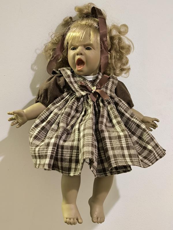 Редкая, высококачественная, виниловая кукла от европейского производителя Panre. Это не просто кукла, а художественный объект, который поражает своей экспрессией. Главные особенности: Клеем: Оригинальная гравировка "Panre" на затылке (подтверждения аутентичности и производителя). Эмоция: Непревзойденный, драматичное выражение крика, гнева или плача. Открытый рот, напряженные черты лица и вьющиеся волосы создают мощный визуальный эффект. Одежда: Полностью оригинальный винтажный наряд - платье в коричневую клетку (тартан) с атласными лентами. Материал: Качественный твердый винил. Идеальна для пополнения коллекций редких Expression Dolls и винтажных европейских кукол. Идеальна для пополнения коллекций редких Expression Dolls и винтажных европейских кукол. Высота 40см