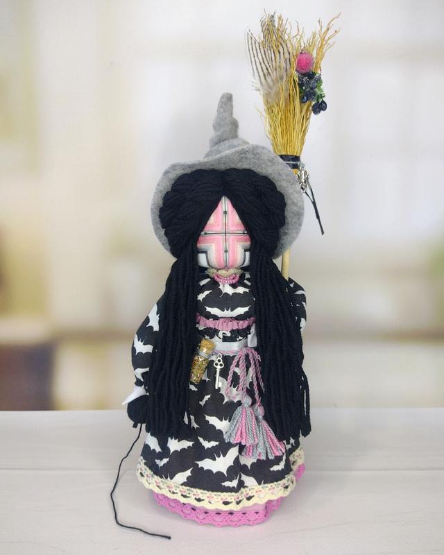 Твоя маленькая подруга, которая всегда рядом, поддерживает и напоминает о твоих глубинных силы. Она о женской интуиции, внутренней независимости и силе Творения, которую мы часто скрываем под обыденностью. 🎩 Шляпа ведьмочки Символ концентрации силы и мысли, напоминания о твоем личном канале интуитивного знания. Это вершина, “антенна”, которая соединяет женщину с полем Вселенной. Он помогает обладательнице куколки слышать ответы внутри себя. 🧹 Митла Один из древнейших женских символов очищения: ✓ выметает лишнее и токсичное из пространства; ✓ снимает энергетические остатки чужих эмоций; ✓ помогает открывать новые тропы. В руках Мотанки метла превращается в инструмент наведения порядка в жизни и мыслях. 🕷 Паук, сидящий на метте Паук - Тотем Создателя. Он тче Долю, создает связи, помогает плеть собственный путь. На метте он символизирует: “Очиститесь – создавай. Не бойся ткать новую жизнь.” 🌿 Бутылочка с вереском Растение ведьм и мольфаров, символ тонкой связи с миром духов и природных сил. В бутылочке он несет защиту интуиции, мудрость в выборе, тонкое энергетическое очищение. Это предохраняет для души, которая развивает чувствительность и слышит знаки. 🗝 Ключ Открывает пути, которые раньше казались заблокированными. Это напоминание, что все ответы - в тебе. ⚫ Черный клубочек: ✓ сбора рассыпанной энергии; ✓ умение “смотать” себя вместе в хаосе; ✓ сохранение внутреннего тепла. Он работает как стабилизатор эмоций и фокус внимания. 🦇 Летающие мыши символизируют: ✓ зрение в темноте, ✓ , видя скрытое чувство, ✓ смелость проходить сквозь трансформацию. Это о том, как женщина находит себя в темных периодах жизни и выходит из них более умной. 💗 Она: 💫 оберегает пространства; 💫 помощница в творчестве и ритуалах вдохновения; 💫 символ поддержки в периоды перемен; 💫 активатор интуиции и ясного видения. Ведьмочка напоминает: “Ты владеешь силой. Ты можешь очистить, создать и направить свою жизнь. Я рядом — и дам тебе во всём.” Рост куколки 21 см (с шляпой 26 см). Шляпа снимается. На подставке.
