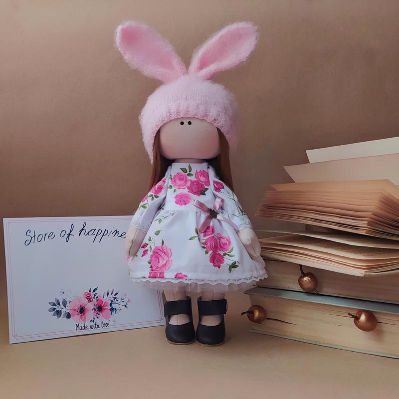Ніжна красуня , яка прикрасить будь-який інтер′єр , додасть затишку оселі та може бути маленьким талісманом свого господаря.Створена із любов′ю та в одному екземплярі. Вона може самостійно стояти та сидіти. У неї рухомі ніжки, ручки та голова. Ріст ляльки 29 см (без врахування вушок).Одяг не знімається.