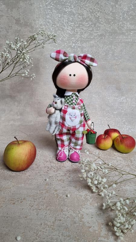 кукла ручной работы с волосами брюнет в образе садоводицы. в комплекте с куклой будет маленький котик выполнен из шерсти и ведро с яблоками. интерьерная кукла, или же кукла для детских игр. размер 25 см.