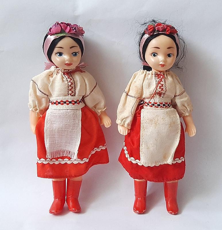 "Украинские девушки", куклы в национальных одеждах, СССР. Состояние по фото - довольно хорошее, имеются незначительные желтоватые пятна на рубашках, от солнечных лучей и времени, у одной девушки немного ослабли резинки держащие ноги. Высота кукол - 24см.