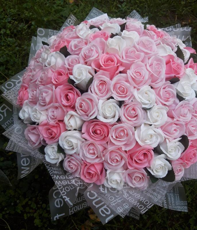 Цвет мыльных цветов - белый, кремовый, фиолетовый, лаванда, розовый, голубой, молочный. Букет из 75 мыльных цветов