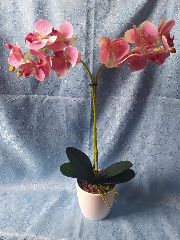Латексна орхідея ручної роботи . Квітка, яка не потребує догляду та поливу. Висота 56см з горшком. На гілочці по 6 квіток . Ширина квіточки 9см. Ширина вазона від початку однієї гілки та до кінця другої 46см. Можлива зміна форми гілки, щоб не надоїла ;)