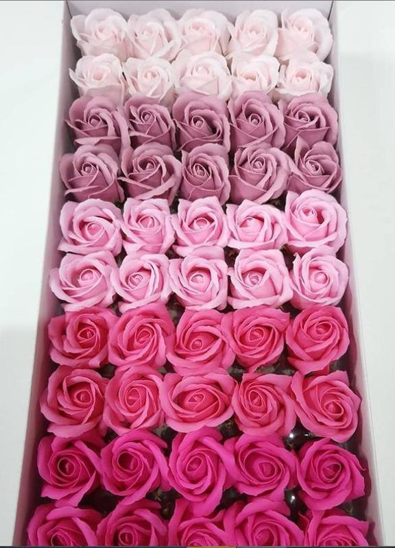 Категория -- микс из мыльных цветов Количество оттенков цветов из мыла -- 5 цветов Плодоножка мыльного цветочка -- зеленый пластик с отверстием под шпажку По 10 розочек из мыла каждого оттенка - от светло-розового до малинового Размер бутончиков розочек из мыла -- 5х5 см Количество мыльных роз в упаковке -- 50 шт Наши мыльные цветы не вянут. А неповторимый и нежный аромат сохраняется от одного года до трёх лет. Цветы, изготовленные на основе мыльной суспензии - это современный тренд в флористике. Ведь неувядающие букеты - уместный подарок любимым, коллегам или родственникам в канун знаменательных события. Ассортимент мыльных цветов состоит из таких оттенков: красный, белый, молочный, розовый, махагон, светло-розовый, малиновый, бордо, фиолетовый, сиреневый. Предлагаем мыльные цветы оптом и в розницу с доставкой по всем регионам Украины. Для корпоративных покупателей предусмотрены специальные цены ниже розничного прайса. Приглашаем ознакомиться с кучерявыми, сердцевидными и стандартными розами из мыла, а также камелиями, георгинами, хризантемами, пионами, сакурой, гортензиями, тюльпанами, гвоздиками, шляпными коробками для букетов из мыльных цветов.
