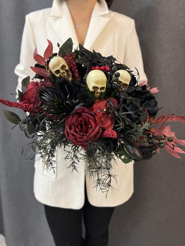 Придайте своему праздничному интерьеру незабываемую ауру Хэллоуина с нашим эксклюзивным букетом. Этот стильный букет сочетает в себе мистический шарм и элегантность искусственных цветов, выполненных в виде черепов, дополненных сухоцветами в черных и бордовых тонах. Создайте неповторимый атмосферный акцент для вашего праздника с нашим букетом для Хэллоуина. Ширина букета 45см, высота 35 см