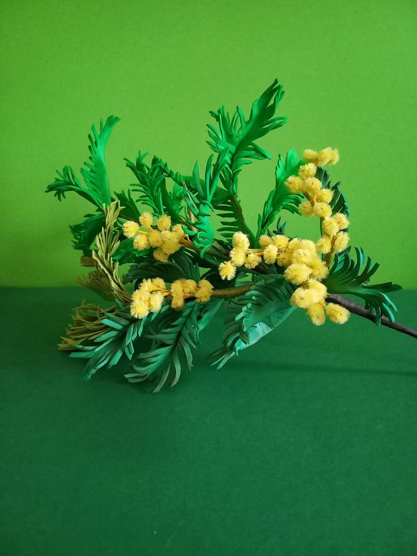 Декор для дома - подарок - веточка мимозы. Весенний кустовой цветок . Материал фоамиран, синельная проволока, флористическая основа. Высота 34 см, объём 17 см. Мимоза в бутылочке - из фоамирана и хлопка. Высота 32 см, основа - 6 см.