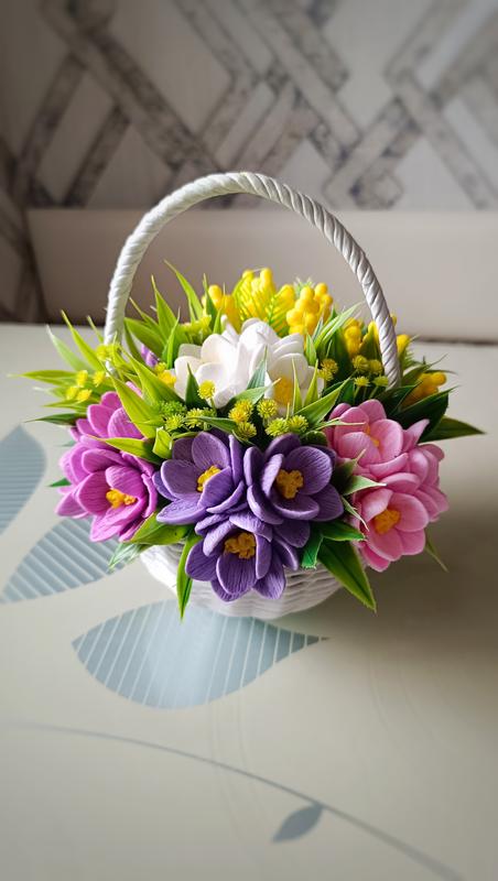 Яркий весенний букет крокусов с мымозой из мыла ручной работы в плетеной корзине. Высота букета 21 см, ширина 20-22 см. Аромат цветочный