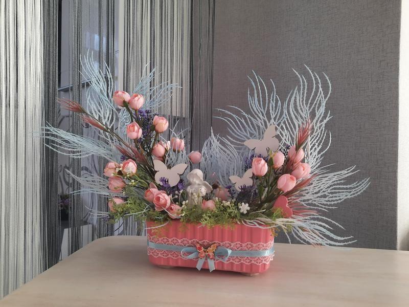 Интерьерная композиция. Аранжировка из интерьерных искусственных цветов. Композиция размещена в кашпо ручной работы из бетона, окрашенного акриловыми красками. В композиции использовано множество декоративных материалов: тканевые розочки прекрасного качества, добавки из мягкого пластика, деревянные бабочки и маленький прелестный керамический ангелочек, высотой 6 см. Проста в уходе, прослужит долго. Высота композиции максимально 25 см., ширина 36 см., до крайней точки, глубина 16 см., Бетонное кашпо 16х7х8 см. Подойдет в детскую или любой интерьер , где преобладают нежно - розовые и голубые тона.