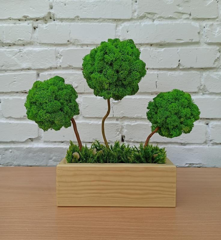 Стабілізовані дерева ( дерева з моху) у дерев'яному кашпо. Довжина кашпо 20 см. Самі крони зроблено з моху ягель, а трава - з моху Прованс. Висота композиції 29 см. Діаметр крон 10 і 9 см.