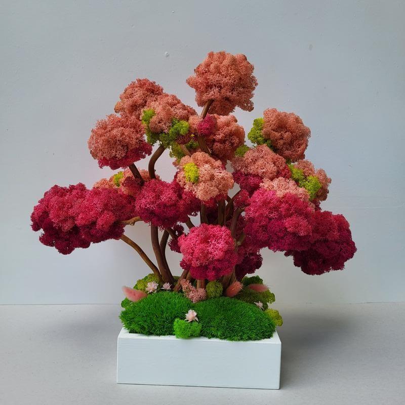 Поздравляю! Предлагаю свою авторскую и очень оригинальную композицию из деревьев, выполненных из мха. Креативный, яркий подарок женщине, девушке, маме на день рождения. А также оригинальный декор для Вашего интерьера. Композиция чрезвычайно красивая и уникальная. Вы точно можете ею удивить свою жену или девушку, или же и порадовать дочь или маму. Каждая женщина будет в восторге от нее. Деревья ( кроны) сделаны из стабилизированного мха трех оттенков розового с добавлением небольшого количества светлого зеленого. Снизу имеем сочетание кочечного мха и мха ягель с сухоцветами. Размах композиции составляет 42 на 36 см. Стоит в древесном кашпо 17*17 см, окрашенное в белый цвет