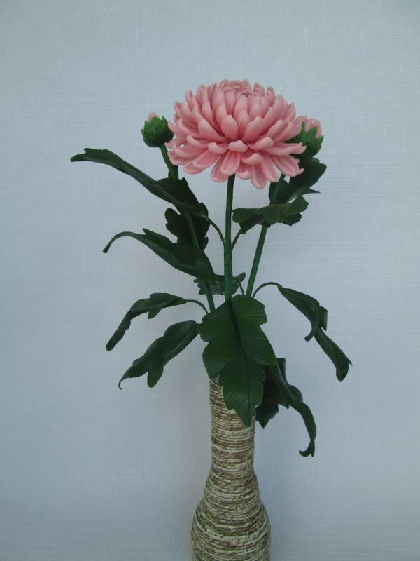 Эксклюзивный подарок на все случаи жизни! Стильное украшение интерьера. Если хотите чтобы подарок напоминал о вас долгие годы, обратите внимание на этот цветок. Красивая, реалистичная, розовая хризантема с двумя бутонами установлена в декоративной вазе ручной работы. Цветок и листья выполнены в натуральную величину и полностью повторяют оригинал. Тщательная проработка всех деталей создает ощущение живого цветка. Эта цветочная композиция способна стать украшением любого интерьера. Она будет радовать своей красотой долгие годы и не доставит хлопот по уходу. Хризантема в вазе не закреплена и может быть установлена в другую, устойчивую, подходящую по размеру вазу. Цена указана со стоимостью вазы. Высота хризантемы с вазой 36 см, длина ветки хризантемы с цветком 35 см, диаметр цветка - 8.0 см.