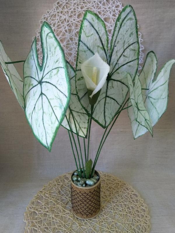 Каладіум Якщо ви вирішили прикрасити свій будинок каладіумом, тоді потрібно пам'ятати, що по завершенню сезону вегетації у нього починається період спокою. У цей час у куща облітає все листя і його розвиток припиняється. У зв'язку з цим найбільш часто кімнатний каладіум культивують як однорічного рослини. Домашній каладиім потребує постійної уваги з боку квітникаря, а також в правильному догляді і відповідних умовах вирощування. При роботі з каладіумом потрібно бути вкрай обережним. Справа в тому, що якщо сік,який знаходиться в листі і містить кристали оксалату потрапить на слизову, то це може привести до розвитку подразнення або опіку. Наш каладіум безпечний і буде виглядати однаково красиво завжди, він виготовлений вручну з дизайнерського паперу і покритий лаком.