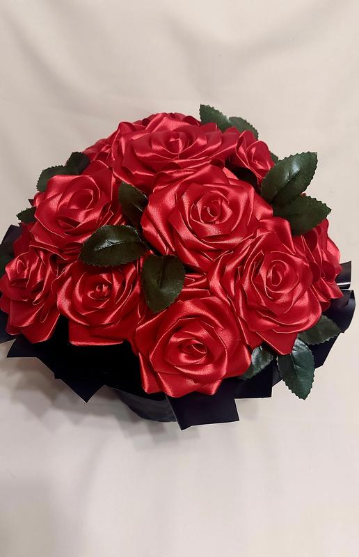Розы из атласной ленты 5см делают заказом 1 роза -35 грн 7 троянд-245 9 троянд-315 11 роз -385 15 троянд -525 21 роза -735 и тд Плюс упаковки от 50 грн.до 250 грн. Если корзина то от 100 гр. Если с блестками розы то +5грн в розу. Время изготовления от 1 -7 дней