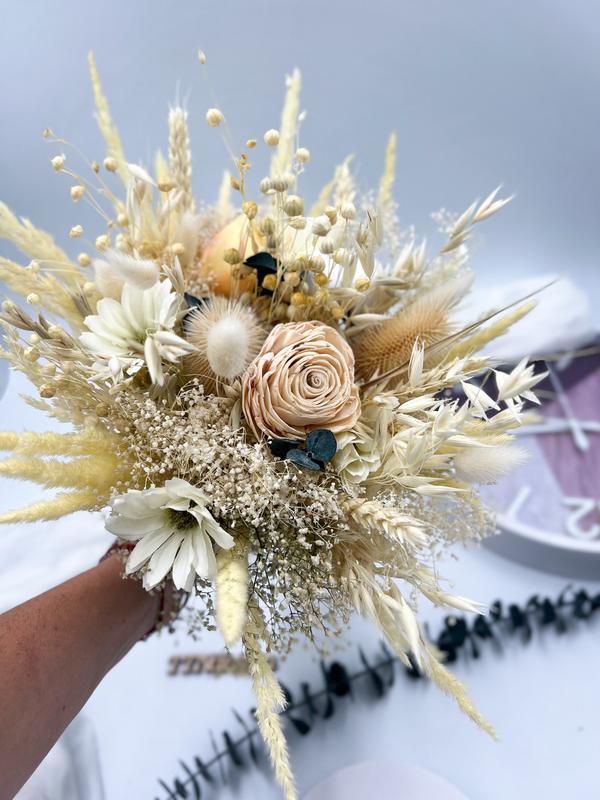 Цей чарівний букет у стилі бохо ідеально підходить для прикраси будь-якого інтер'єру або як подарунок для особливих подій. Він виготовлений із сухоцвітів, штучних ромашок, квітами шоли, хлопковими квітами, стабілізованим евкаліптом та іншими сухоцвітами. Ширина букета становить 27 см, висота - 30 см. Виконаний в натуральних тонах, цей букет створює теплу та затишну атмосферу.