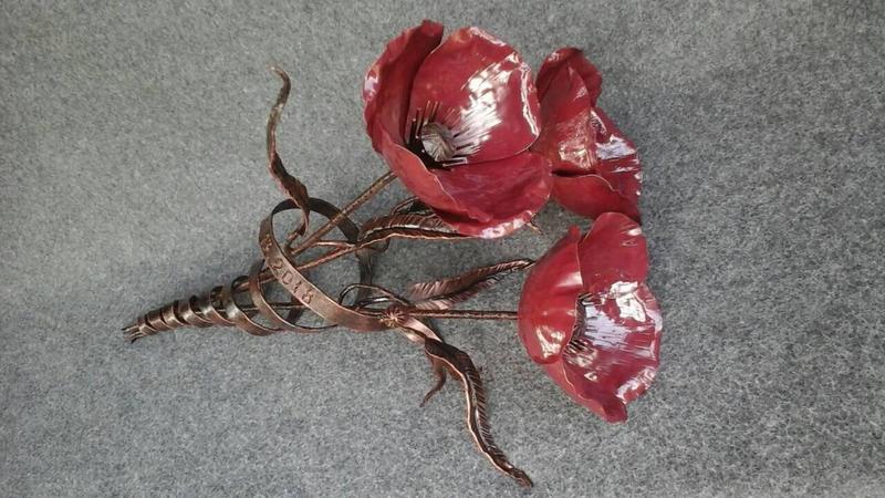 Любите цветы, особенно маки? Вот кованый мак ручной работы. Как вариант к нему можно добавить красивую ленту с гравировкой на заказ. По умолчанию лента не входит в цену. Размер: Длина: 50 см Вес: 0,6 кг Размер бутона: 14 см x 14 см Цвет бутонов мака: красный. Очень красивый цвет! Цвет стебля, листьев и ленты: черный с медным налетом. Смешение цветов делает этот цветок особенно красивым! Хороший подарок на свадьбу, годовщину свадьбы, день рождения, День матери, и многие другие праздники или просто как декор для дома.