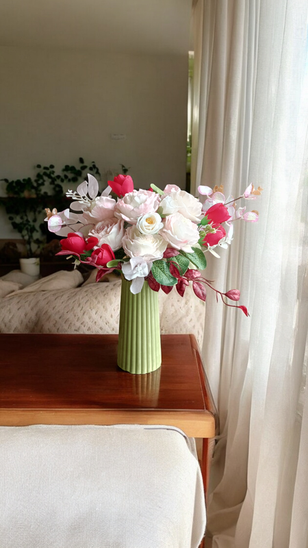 На фото изображены цветы и зелень премиум класса, изготовленные из милой ручной работы. Композиция состоит из нежных белых и розовых цветов с акцентами красных бутонов. Они выглядят реалистично и прекрасно сочетаются с зеленью и декоративными веточками. Все элементы находятся в светло-зеленом весе с вертикальными линиями, что подчеркивает элегантность композиции.