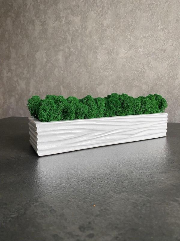 Брашированное деревянное кашпо со стабилизированным мхом Кашпо брашировано механическим путем, благодаря этому видно и ощущается на ощупь рельеф дерева. длина 29 см Возможны для заказа разные цвета мха. Ручная работа. Можем изготовить любые размеры и количество Стабилизированный мох - это настоящая находка, ведь за ним не нужно ухаживать, от слова совсем. Преимущества мха: -сохраняет насыщенный цвет и естественную мягкость до 10ти лет; -гипоаллергенный; -имеет антистатическую поверхность( за счет глицеринового раствора в котором он вымачивается, пыль на нем не скапливается); -его не нужно опрыскивать, поливать; -не требует освещения; -в нем не заводятся насекомые, разные вредители и плесень Главные советы по продлению срока эксплуатации мха: - Не расшешивайте мох под прямые солнечные лучи если на мох ежедневно будет светить солнце, он быстро выцветет - в помещении не должно быть холодно или жарко если температура ниже +4 или выше +35 градусов, мох быстро высохнет. - Не расшивывайте мох возле нагревательных приборов (кондиционеров, батарей, даже теплого пола) расстояние от приборов должно быть от 1м. - Не мочите и не опрыскивайте водой если мох намочить то с поверхности смоется раствор, таким образом он будет сохнуть и терять цвет - поддерживайте влажность воздуха 40-70% влажности если влажности в помещении недостаточно, ее можно повысить увлажнителем воздуха, или если у вас небольшое изделие из мха то достаточно возле него поставить стакан с водой и мох снова станет мягким. - Убирайте пыль с поверхности раз в 4-6 месяцев щекотливым движением щеткой для пыли или холодной струей воздуха фена У нас вы получаете: _Лучшая рыночная цена _Качественный продукт _Детальную консультацию _Надежная упаковка _Стильный декор, который никого не оставит без внимания