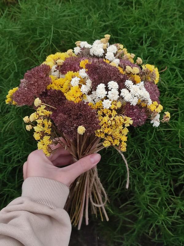 Предлагаю букет из сухоцветов высушенный и составленный собственноручно. Цветы, которые не завянут и будут радовать глаз долгое время. Станет отличным подарком или дополнением к нему. Диаметр букета - 20 см. Также, могу сделать под заказ в других цветах и размере.