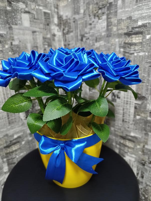 композиция из 8 больших роз из атласных лент в горшке, устойчив к ветру